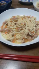 あんかけひやむぎ ひやむぎに玉ねぎ、人参、干し椎茸、ひき肉を入れたあんをかけていただきました😊あんの味付けは出汁の素、砂糖、酒、醤油、椎茸の戻し汁です。あんをかけたところを撮ろうと思っていたのに、かき混ぜてから気づきました😅夏に残ったひやむぎの消費にいいですよ😊