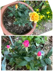 ミニバラの植え付け 今日は、一日中、お庭です。 買って来た花苗の植え込みと、肥料やりに追われました。 枯れて何が植ってたんだろうか❓と思われるような鉢をひっくりかえして土の整理をした上で、新しい土もいれこみ、 肥料も足して、、全ての空き鉢に花がスタンバイ出来ました。て点検したら、あと一つ、まだしないといけない鉢があっ