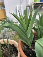 チューリップも出番待ち この暖かさで、次々と花が咲きそうです。昨年、ちょっと変わった形のチューリップの球根を見つけたので購入。一気に蕾が伸びてきました。2、3日で咲きそうです。でも…チューリップの葉のつき方ってこんな風だった?上から見るのと横から見るのではずいぶん違うな…🧐