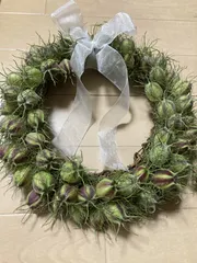 素敵です✨うちにもニゲラあって、思ったより沢山咲いたので、カットして吊るしてますが、まだ残っていてどうしようかと思ってました。リースにするのいいですね。