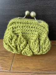 毛糸のガマ口ポーチ リーフの編み込み柄のポーチを作りました🤗小さめだから、アメちゃん入れになるかなぁ🎵編み物はコツコツと、暖房の効いた部屋で癒しの時間になります👍