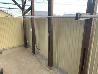 サイディングの内側は角波板 サイディングの内側、カインズの8cm厚のブラックを1段カインズで買った角波トタン9尺を半分にカットして貼りました、上部はブラックのブリキを板金、