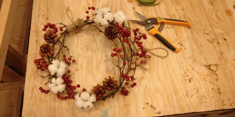 サンキライのリース作成に参加しました。 折れそうで恐々でしたが、初めて扱うグルーガンでコットンや松ぼっくりなどを固定して、なかなかの出来上がりで楽しかったです。