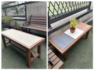 以前作ったタイルを使ったベンチとプランタースタンド。友達にタイルのサンプルをおねだりしたものが手に入ったのでイメチェンしてみました👍ベンチはなんだか国旗みたいで自己満😆だけどタイルの材料は寸法的に2種類あって、300角でいうと目地共(込み)寸法の295ミリぐらいのものと、実寸の300ミリのもの。まえ