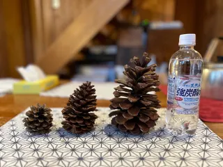 デカい松ぼっくりのトゲ取り 松ぼっくりの比較画像です。左から「黒松」「テーダ松」「大王松」「500mlペットボトル」大王松はほんとデカい。なおさんとmiminさんの仰ってるゴルフ場に多いやつ、は真ん中のテーダ松じゃないかなぁ。んでもって、先にトゲがありますよね。 このままだとけっこう痛いので…私がいつもやってる方法で