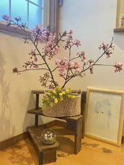 桜の季節になりました🌸 先日、ワークショップで作成した花台に頂いた桜🌸と、自宅に咲いたミモザを飾ってみました😊💛💚💛あいにくの雨模様ですが気分上げていきます🎶🤗