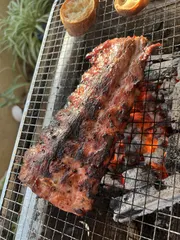 スペアリブ スペアリブの肉があったので、味付けして漬け込んでおこうと思い,今回は台湾のチャーシュータレにつけ込むことにしました。紅麹を買っていたので表面に塗り、チャーシューのつけ込みたれを塗り込み2日ほど冷蔵庫でねかしてました。オーブンで焼こうと思っていましたが、お天気がとっても良かったので、庭でお肉を焼くこと