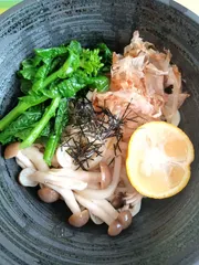 昼ご飯季節のうどん! 庭のゆずと菜花を添えて、冷しうどんです!