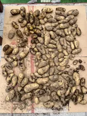 梅雨の隙間を狙っての収穫です。3月14日投稿(リンク→ https://diy-square.cainz.com/announcements/lnp9slecov674lcw )の種イモ植えから3ヶ月足らず、一般的には100日が目安らしいんですが、雨だと何にも出来なくなるんで。収穫前の様子。だいぶ葉