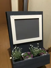 昨日に引き続き、同じ店舗で作った『黒板付きフラワースタンド』少しアレンジです。 先生大変、出来上がったら黒板が付いてる所と、後脚の幅が違うではありませんか。でも、私は安定するので、そのまま完成させて持って帰ってきました。 看板の所は、少しアレンジさせて頂きました。斜めのカットは大変です。ここに写っ