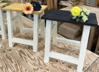 ミシンイス 念願のミシンイス。先生や参加者の方々が手際よくサクサク作業。終了時間も定刻より早く終える事ができました。余った時間でカインズさんのお花を買って帰える事ができ楽しかったです。ミシンイスの色違いも素敵!二台目、三台目が作りたくなる作品でした。(右側のイスが私の作品)