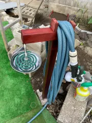 2021年11月28日投稿「蚊取り線香スタンド」(リンク→ https://diy-square.cainz.com/announcements/xzku6zhfdgdim0zi )のその後です。改修前の様子です。ヘッドの部分を変更して横から見た時Tの字にして、更に木片を2箇所付けて、園芸ホースを纏