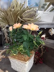 初めてのバラの寄植え🌹冬の暗いお庭が明るくなるようオレンジにしましたアンティーク調の鉢との相性、ピッタリです!