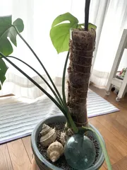 SDGs ペットボトルの再利用でモンステラの支柱を作ってみました。これを伝ってぐんぐん上に成長してもらいたいですねー🤗{材料} +麻ひも柿の木の枝をにニスを塗って補強3つのペットボトルにを切れ目を入れてつなぎ合わせミズゴケを詰めてみました〜自己流で作ってみましたがなかなかの出来でした。