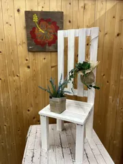 インテリアチェア ずっと作りたかった作品でした、キャンセル待ちで運よくできました800円は魅力てす❣️新色も魅力的で悩みましたが、超撥水のホワイトで、塗り塗り完成🙌と、家に帰って、、😅、てっぺん、、塗り忘れ、、😆久々のうっかり😨やってしまいました 、、下から塗っていって、、最後はイスを作業台に立たせたまんま