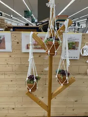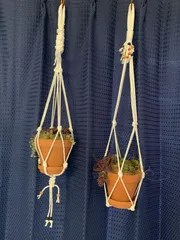 GWS プラントハンガーで飾る多肉寄せ植え 先日2日にわたり 開催され2回 参加して 2個作りました それぞれ 残りのロープでアレンジしてみました 左は 人形の型 右は ウッドビーズを通して レゲエ風の髪型🇯🇲