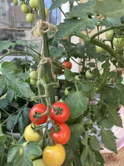 🍅トマト赤くなりました。 ■育てた野菜 ミニトマト■工夫したポイント 収穫を増やす為,苗を斜めになるようにして,支柱にまきつけて、育てています。