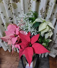 ポインセチアの寄せ植え作りました ユーフォルビア白雪姫とポインセチア合わせてみました☺️💕ポインセチアは寄せ植えなどでちょっといじると弱っちゃいますね 今朝見たらピンクがちょっとしんなり😱⤵️