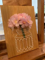 ストリングアート ストリングアートWS行ってきました。今日は電動ドリルではなく、ひたすらトンカチ トントン!ちょっと失敗歪みがあっても糸が掛かればまあ大丈夫🙆♀️ 糸掛けが、迷路してる様で楽しかった〜🤗DIYと言うより手芸みたいでした。お家で用意しておいた桜🌸の造花入れました。季節ごとのお花飾れて重宝しま