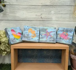 ステンシルコースター ステンシルコースターを作ってきました✨海シリーズな感じで、海中に生き物がいるイメージで塗装に取り組んでみたのですが、ちょっとゴチャゴチャしちゃったかなぁ🤔 タツノオトシゴさんはもうちょっとハッキリさせた方がよかったですよね💦 ヒトデさんはご一緒した方が持ち込みされていた塗料の紫色