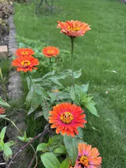 ハロウィンカラーの百日草 朝晩涼しくなったせいか、お花の色が鮮やかになってきました。倒れた百日草🌼ですが元気に花を咲かせています^ ^