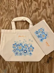 アデリアトート&ポーチ2 ■作品内容 ・アデリアトート&ポーチ ■こだわりポイント ・青系で揃えて、混色しながら塗ったこと ・文字の色は、花の中で使った色を使ったこと