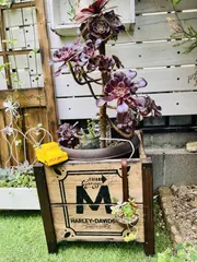 皆さんが作られて植木などを入れて玄関先とかに置いてある画像がとても素敵で……私もこれ作ったはいいけど、あまり気に入らなくて端材ポイポイ箱になってましたが、本日やっとお外デビューしました。