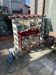 庭作業グッズ置き場 端材を利用して、ガーデン雑貨置き場を作っています。元々、カフェ風にして、テーブルやチェアを置いていましたが、ガーデン雑貨が増え、作業をしやすくするために、変更しました。