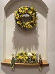 ミモザ飾り💛🌿 カインズ金網コーナーにて切り売りの金網を購入、形を作りスプレーでペイント🤍🤍した中にミモザを埋め込んでみました💛🌿🤗ローズマリーも忍ばせています✨✨しばらくは香りも楽しめそうです🎶