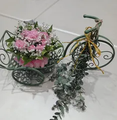 ケーキ風ギフトフラワー 本日のグリーンのWSは『ケーキ風ギフトフラワー🎂』カーネーションを中心に花🌸や葉🌿を同じ長さに切って丸いボックスのオアシスに挿していく。中のオアシスが見えないようにバランスよく😁✨🎶いつも考え過ぎてしまうので、本日は気の向くままどんどん入れる。隙間見つけて入れる。で出来上がり😊❤️👌隣のユーカリもも