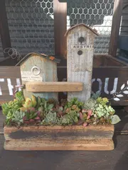 多肉寄せ植え 花友フェスタでこのお家が気に入って購入したものの、ずっとそのままで😅💦やっと寄せ植えしました😊💕寄せ植え技術はまだまだですが、楽しみながら増えていったらな✨と思っています😄🎶