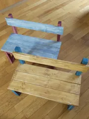 1脚は以前作ってみんなが座ってくれたおっと、予定外😻😹これでは足りない😆取り合いになる!ので😆 この🥵暑い夏、エアコンバンバンにかけたリビングでのこぎりギコギコ、2脚目を作りましたょ! 座面と背もたれは爪研ぎになっていた1×4を60㎝でダメージの少ない場所を探して4枚とり、脚部分