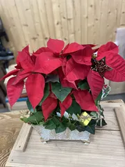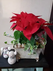 クリスマスの寄せ植え ポインセチアをうまく育てられないのですが、今回はちゃんとお世話できるといいなぁ☺️鉢が可愛い❤️ポインセチアで、家の中がクリスマスっぽくなってきました🎄