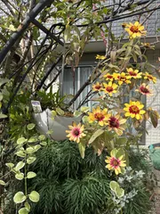 ワイヤーリース寄せ植え 作成から1週間経ったのでフェンスがけしました。モノトーンな庭に彩りが出来ました❣️