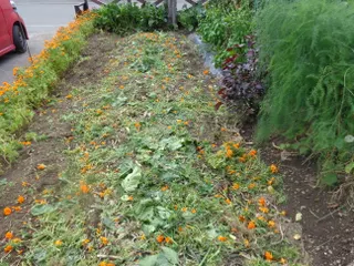 夏の間、がんばったマリーゴールドちゃん。今度は土の中で活躍してくれるのらぁ~(^^) こんにちは、totoroです。北海道の花壇や菜園はそろそろ終了して冬準備に入ります。夏野菜はもう終わりですので、その茎葉は来年の土づくりのために活用します。それといっしょに畑に入れるのが、マリーちゃんたちです。緑肥というやつですね。細かく刻んで畑にすき込むんですが、緑肥と言っても肥料になるわけじゃな