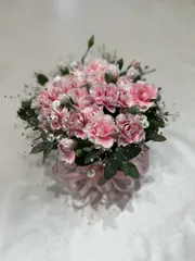 ケーキ風ギフトフラワー 名古屋みなと店にて カーネーション,ユーカリ、カスミソウでケーキ風とは言われましたが、かろうじて丸のようになったかしら^_^