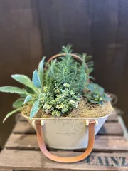 ハーブとイチゴの寄せ植え 名古屋みなと店にて 横20cm位の持ち手付きのかごにハーブ3種とイチゴを1株寄せ植えしました。 ローズマリーの香りがして癒しの可愛い寄せ植えになりました。
