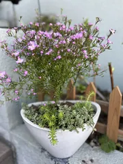 植え替え講座で 名古屋みなと店の植え替え講座に参加して花選びでピンクのボロニアに魅せられて思わず手に取りました。セダム2種を添えたら可愛く?なりました。