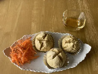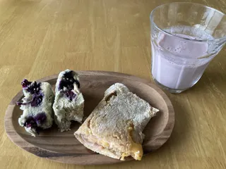 残り物で朝ご飯 メニューはブルーベリーのおから蒸しパン🫐オートミールのブリトーもどきブルーベリー黒酢の豆乳割りです。ここにサラダ添えられるとよかったなぁ🥗