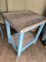 ヘリンボーン サイドテーブル ワークショップで作りました天板の木目が美しいテーブルです木目が活かせるように薄い色で 天板は ペイントしています土台部分は薄塗りでさささっと ペイントしていますもともと違う色の木材を組み合わせて作るのかと思っていたら そうではなくって 角度によって色が変わって見えるみたいですね