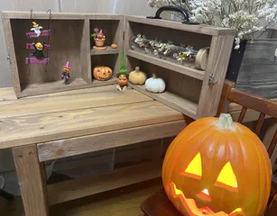 トランク風小物ケース ■作品内容 トランク風小物ケース ■こだわりポイント トランクをオープンした時のつながりを 考えて2段の棚の高さを合わせました😊 10月に入ったのでハロウィン🎃の飾り付けをしてみました👻