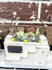 ポスト📮型ブリキポットに♪ ■作品内容 割と大きめのポスト📮型ブリキポットを、一目惚れで購入そこに多肉を植え込みました■工夫ポイント ポットが大きかったので、下半分には発泡スチロールを細かくして底上げをしました今でもお気に入りで、多肉を追加したりして育てていますただ、、、この夏の酷暑でブリキポットが日焼けし
