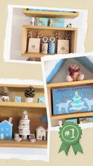 Xmasディスプレイ3段です( ´∀`)✨ ■作品内容テーブルシェルフ3段をディスプレイ棚にアレンジした物に、手作りのXmasオブジェを飾りました。ポリエチレンフォームで作った屋根の上に、雪に見立ててファー生地を乗せました。既製品のぬいぐるみにマフラーを巻いて屋根裏に配置。トナカイのステンシルボードはシートも手作りです。屋根の残りでプレゼント