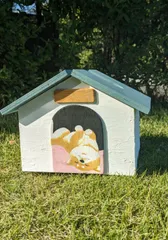 犬小屋風🐾 おうち型ティッシュケースを作ってきました‼️ 店舗で見本を見た時に犬小屋風にしたい‼️とビビっときたので、端材を購入し出入り口風にノコギリで切り、アクリル絵の具でくつろいでる柴犬を書いてみました🐶 壁の所はモルタル風に仕上がるペンキを持ち込みして塗っています✨ 完成して