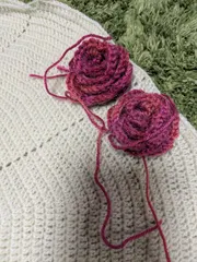 第2弾🌹ブランケット半分まで終わりました 今回は義母へ🎁なので丁寧に編んでます🤭ブランケットは2玉なんですが1玉編み終わりました👍薔薇はグラデーションタイプの濃いめのピンクを選びました前回は増し目を端にしてたらズレ具合な感じなので真ん中辺りで適当に増しました😅左が前回のガタガタなの💦やはり勢いだけで編むと駄目ですね😂