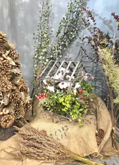 森の中のX'mas🏠⛄🎄✨ お花やさんの寄せ植え教室にて、"フラワーデコハウスに植える、 森の中のX'mas⛄🎄✨"を 作りました🎶。 可愛らしいこちらのアイアンのデコハウス🏠の器に、🔰初めましての出合いで😍でした💓。 お花達です💕。 どのお花やリーフも、とても