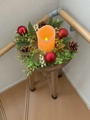 ■作品内容クリスマスリースライト■工夫ポイントいつもは階段にライトだけを置いているのですが、クリスマスが近いので、小型のリースを作り、真ん中にライトを置いて華やかさをだしました。リースの土台は木を四角に置いて、その上にボンドで飾りをつけていきました。軽いので、壁掛けにもできます。※以下カインズクリス