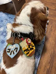 自慢のネームタグ ■全て手縫いと切り貼りしました!フェイルトと金具を縫い合わせて作りました。裏には迷子札(電話番号を書いてあります)お散歩中に知らない方からも名前を呼んでもらえるようになりました〜♪可愛いくて、ワン友にも作りました!!