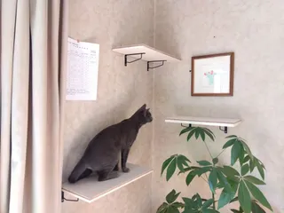 ■作品内容キャットウォークとステップをDIY! ■作品のこだわりポイントステップの一部は猫さんグッズの収納やトイレも兼ねて、キャットウォークからタワーまで、好きなように走ったりジャンプしたりと、一周できるように作りました♪その時々で気に入った場所でお昼寝しています♪