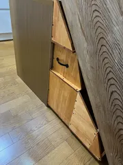 少ない予算でDIY。 300幅、200幅、100幅板の軽い物を購入して設計図に近づけ側面の一部は、合わせ釘を使用して板が無駄にならないように繋いでみました。階段下に隠れるから見えないので良しとします。 キャスターを付け、ス